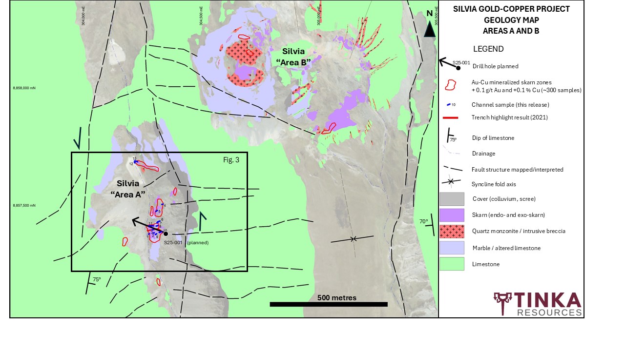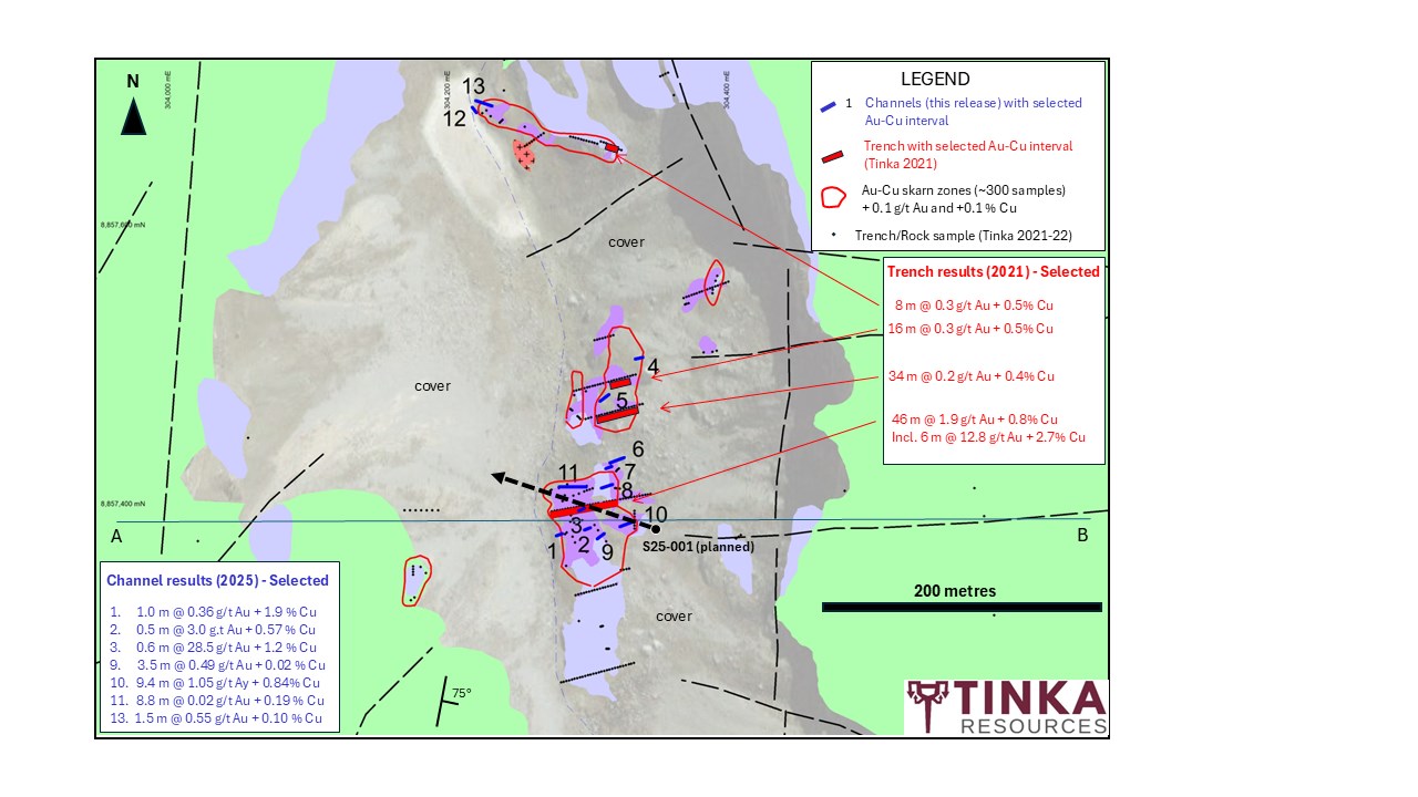 In September 2025, a third-party mining company carried out a limited validation sampling program of the gold-copper mineralization in the skarns at Areas A and B, and these results have been made available to Tinka. Samples were collected along continuous channels or chip channels at various locations at Area A, with each channel between 0.5 and 9.4 m in length. The third-party did not sample the entire widths of previous Tinka trenches but chose to sample narrower intervals in different parts of the same outcrops. Each channel was represented by up to five individual samples with each sample between 0.3 and 3.0 m in length. Table 1 below summarises the full results of the continuous channels, which are plotted in Figures 2 and 3.