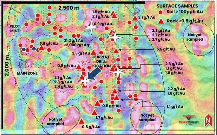 Figure 2: South Block with surface geochemistry and 1VD magnetics highlighting key target areas for new discoveries and expansion potential. White star denote location of recent exploration drilling completed.
