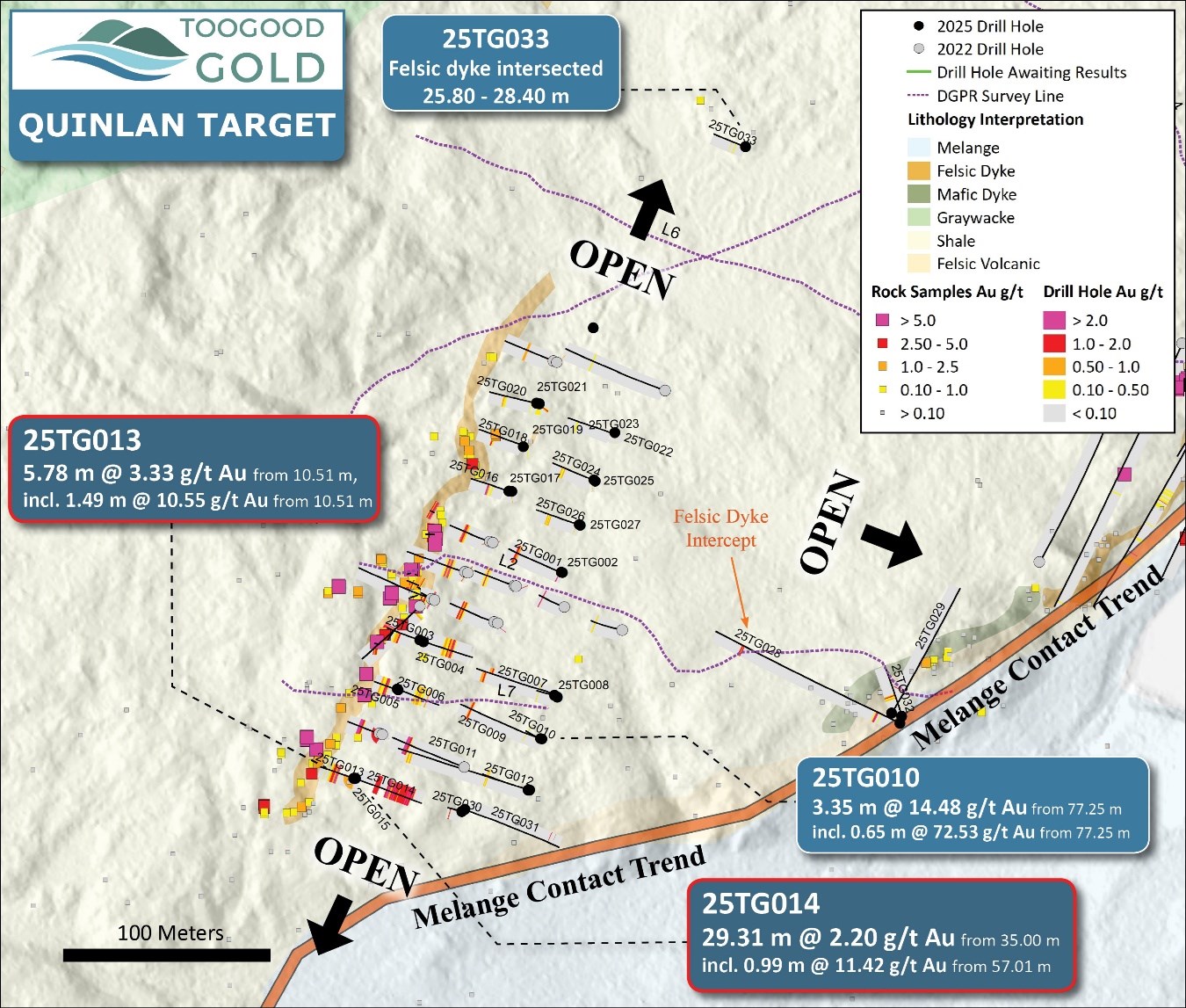 "2025 drilling at Toogood materially expanded the mineralized felsic dyke (down-dip +100%, strike +75%) and confirmed the Mélange Contact as a district-scale gold-bearing trend that extends for more than 15 km across the Toogood Gold Project," said Colin Smith, CEO of Toogood Gold Corp. "A 100% hit rate of gold-bearing sulphidic contact mineralization at Mélange validates this corridor and warrants immediate, systematic follow-up to define geochemical and structural drill targets."