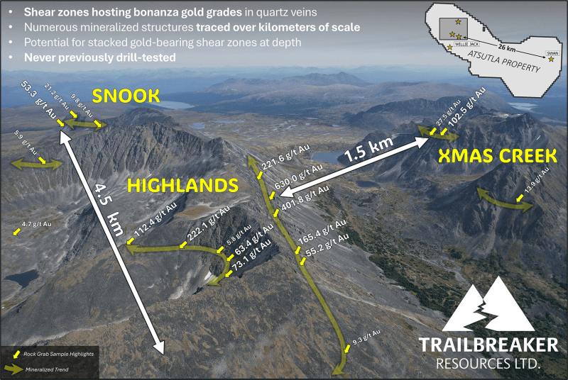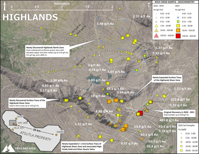 January 8, 2026 TheNewswire - Trailbreaker Resources Ltd. (TBK.V) ("Trailbreaker" or "the Company") is pleased to announce results from its 2025 exploration program at the Atsutla Gold project in northwestern British Columbia (BC). Detailed prospecting and mapping in the Highlands zone area has expanded the known footprint of high-grade gold (Au) showings and led to discovery of new high-grade copper-gold-silver (Cu-Au-Ag) showings on recently acquired claims.