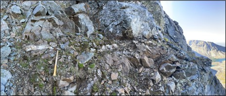 | 2013402 | 65.1 | 70.3 | 1.55 | Outcrop | Pinch-and-swell quartz vein up to 20 cm wide with patchy sulphides. Vein is foliated with 5% sulphides (pyrite, chalcopyrite, and galena locally). Traced up cliff for 10 m. Oriented at 200/40. |