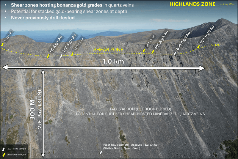 Previous exploration at the Highlands zone led to discovery of a shallowly-dipping shear structure which hosts high-grade gold-bearing quartz veins, returning assays up to 630 g/t Au. During the 2025 program, the structure's continuity was explored on recently acquired claims, expanding the Highlands zone structural feature to a 1.0 km x 1.2 km area. A zone of high-grade copper and silver, the Highlands North zone, was also discovered 1.1 km north of the high-grade gold showings.