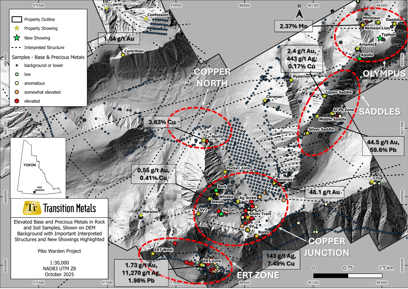 Transition Metals Corp. (TSXV: XTM) ("Transition" or "the Company") is pleased to report assay results from the summer sampling activities at its Pike Warden Project, located near Whitehorse, Yukon. These samples were collected in conjunction with an induced polarization (IP) geophysical survey conducted over accessible portions of the Copper North and Copper Junction target areas (see news release dated September 9, 2025). The program aimed to broaden the project's geochemical coverage across multiple high-priority target areas, including Olympus, Copper Junction, Copper North, ERT, and peripheral targets to the IP survey area (Figure 1).
