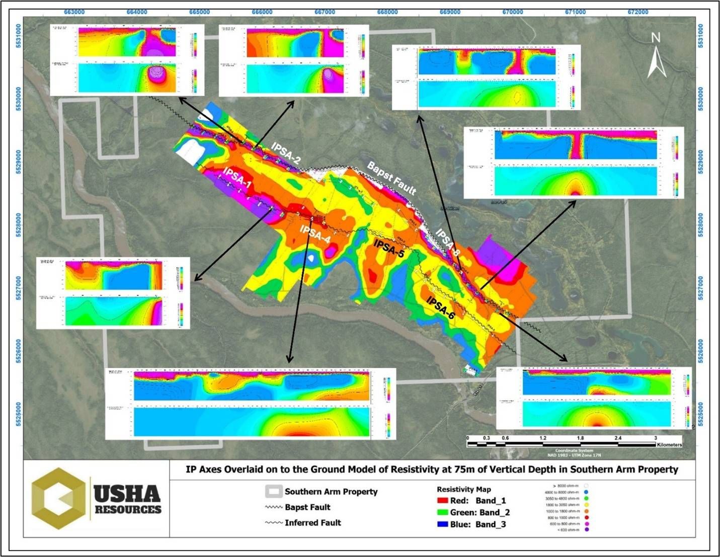Primary targets for advanced exploration (IPSA-2, IPSA-8) are high-priority, structurally controlled anomalies, directly associated with the Bapst fault. Secondary targets (IPSA-1, 4, 5, 6) are located in the zinc zone and southeastern area, representing subordinate, lower-contrast induced polarization (IP) anomalies requiring follow-up. (Fig. 2).