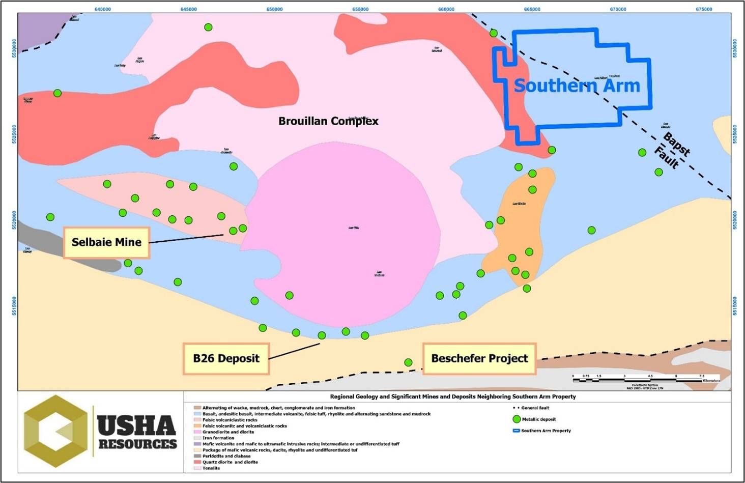 The Southern Arm property consists of 76 contiguous mining claims covering 4218 hectares, located in the prolific Abitibi greenstone belt. This property contains many geologic features consistent with VMS mineralizing systems. It hosts an approximately 7.3-kilometre conductive copper-gold trend along the regional-scale Bapst fault. The bedrock geology of the Property is dominated by the volcanic rocks of the Brouillan-Fenelon group, which hosts the nearby Selbaie mine (~17 km SW), which produced 56.5 million tonnes (Mt) at 0.9% copper (Cu), 1.9% zinc (Zn), 0.6 g/t gold (Au), 38 g/t silver (Ag)1 and Abitibi's B26 deposit (~16 km SW) which hosts an indicated resource of Indicated 13.0 Mt at 2.1% CuEq and 12.3 Mt Inferred at 2.2% CuEq2.