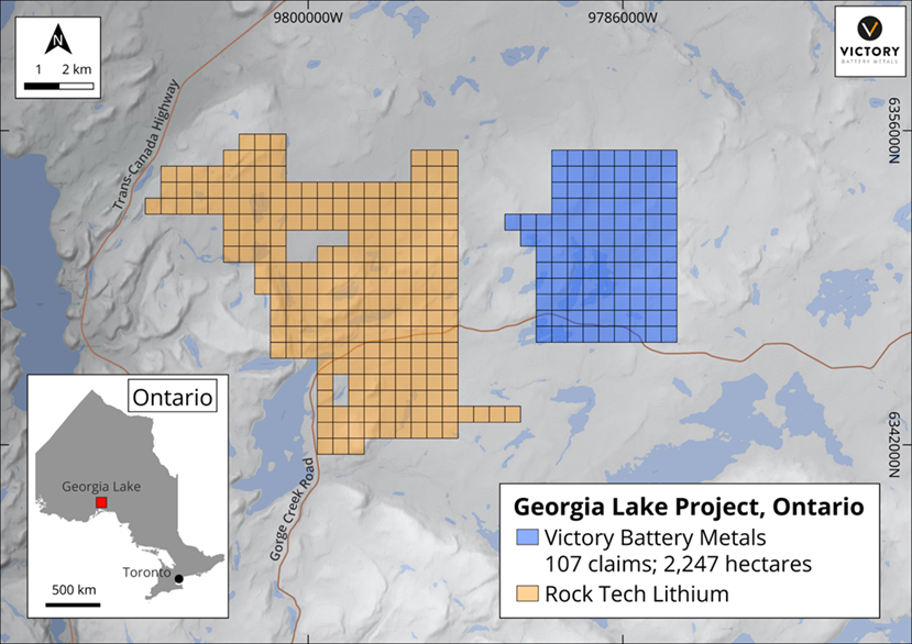 - Victory's Georgia Lake property is 2 km east of Rock Tech Resources advanced lithium project within the Georgia Lake lithium District and hosts numerous Li bearing pegmatites