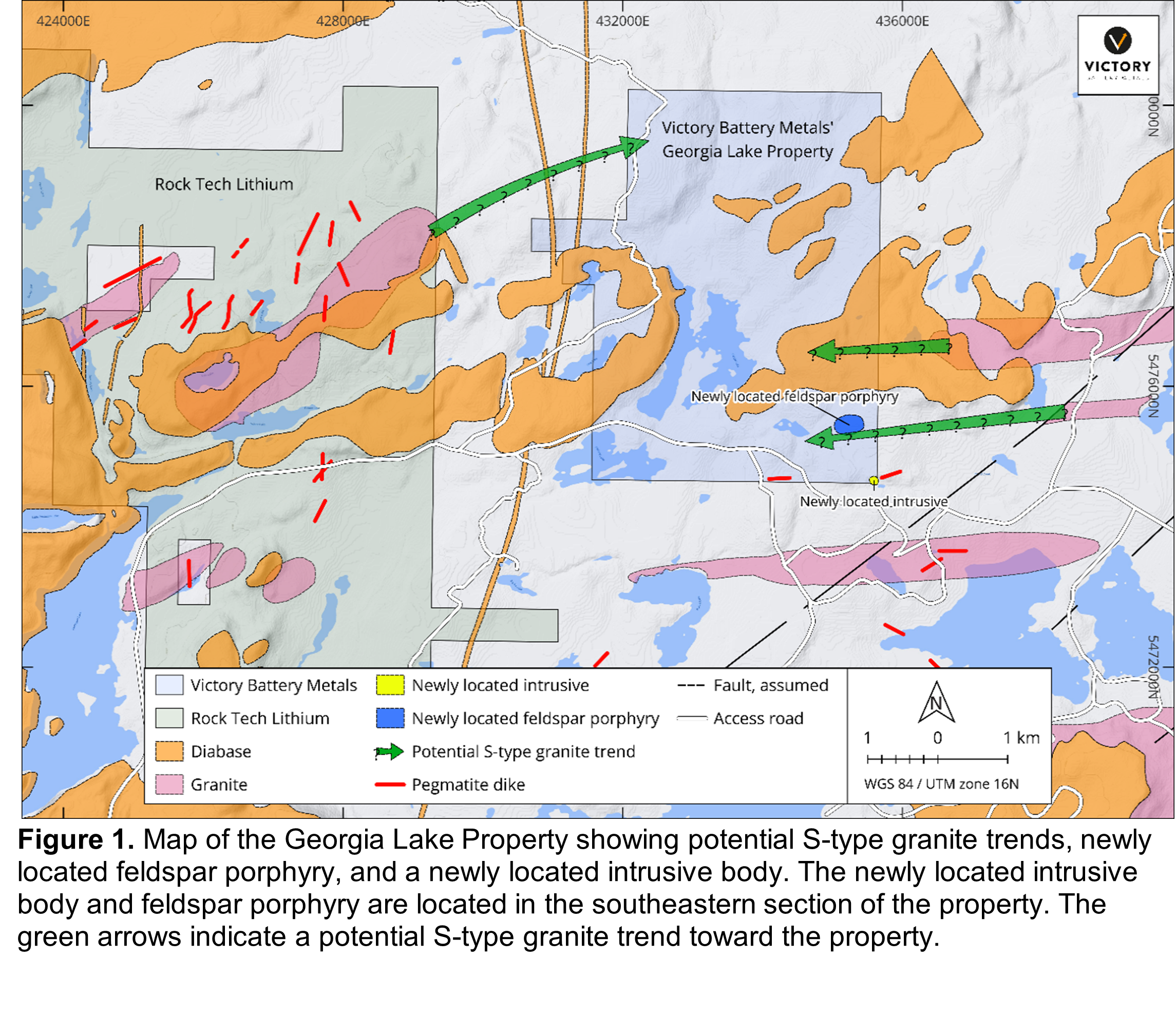 Victory's exploration team has recently completed its summer work program on its Georgia Lake Lithium property and have identified a previously unmapped intrusive unit, a feldspar porphyry, and granitic rock trending towards the property (Fig. 1) . The significance of the newly noted discoveries is that they show the potential of the property to host previously unmapped intrusives (including pegmatites). There is one belt of intrusives striking northeast towards the property from the Rock Tech ground and two other granitic belts mapped as approaching the property from the east. From all indications, the newly found intrusive body is on trend with the southern of those granitic belts.