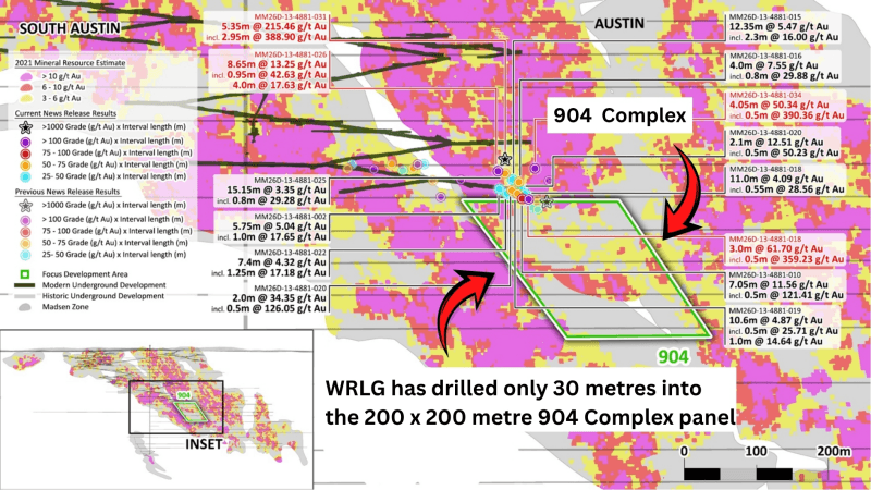 "The 904 Complex in lower Austin is steadily growing into a very important part of the future at Madsen," stated Will Robinson, VP of Exploration in the April 13, 2026 press release. "Having only just gained access to this area for drilling in late 2025, the results received to date are highly encouraging.