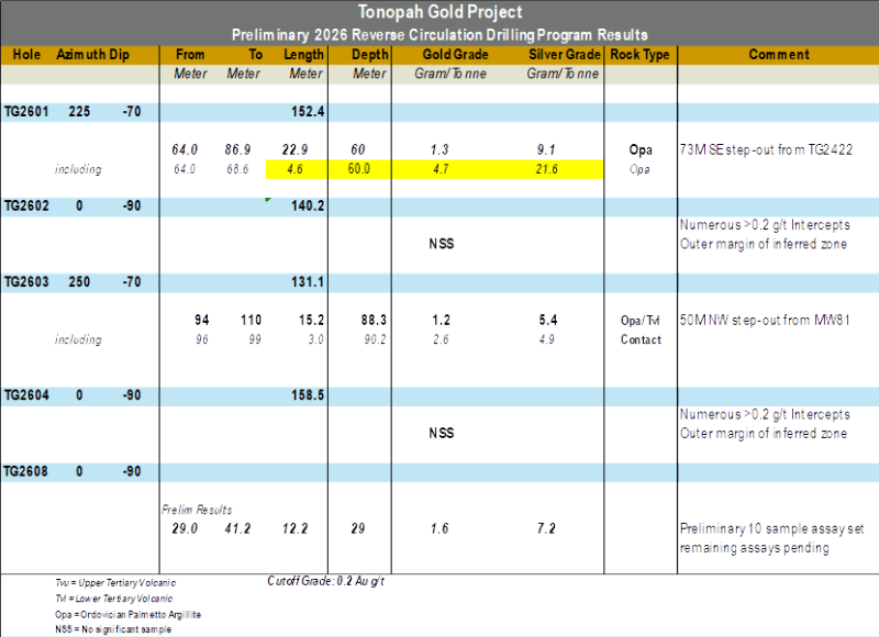 VANCOUVER, BC TheNewswire - April 23, 2026 Viva Gold Corp (TSXV: VAU,OTC:VAUCF; OTCQB: VAUCF) (the "Company" or "Viva") is pleased to announce initial results from its 2026 reverse-circulation ("RC") drill program, along with an update on pre-feasibility and baseline study activities at its Tonopah Gold Project ("Tonopah," or the "Project") in Nevada. Tonopah is 100%-owned by Viva and is located on the prolific Walker Lane Mineral Trend in western Nevada, approximately a 30-minute drive south of Kinross Gold's Round Mountain Mine. Initial drill results have identified new areas of near surface, higher-grade mineralization, with additional assay results pending.