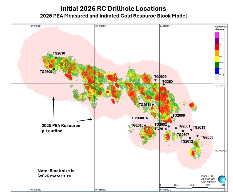 Fifteen drill holes totaling 2,407 m have been completed to date in the 2026 RC drill program. Assay results have been received for holes TG2601 to TG2604, and an initial 10-sample batch has been completed for TG2608, with remaining results pending. Turnaround times for assays have increased from approximately three weeks to five to six weeks. Initial highlights include: