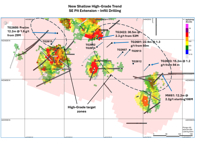 Results to date define the potential for two new zones of higher-grade gold mineralization starting near surface. Six holes, including TG2601 and TG2603, were drilled along a 300 m trend that dips to the southeast between historical hole TG2422 on the northwest end (30.5 m @ 2.3 g/t Au from 53 m depth) and MW-81 on the southeast end (12.2 m @ 2.24 g/t Au from 108 m depth; drilled in 1994). A second potential zone has been identified in TG2608, which intersected mineralization starting at 29 m depth. Additional completed holes are expected to further refine and confirm these zones as remaining assays are received.
