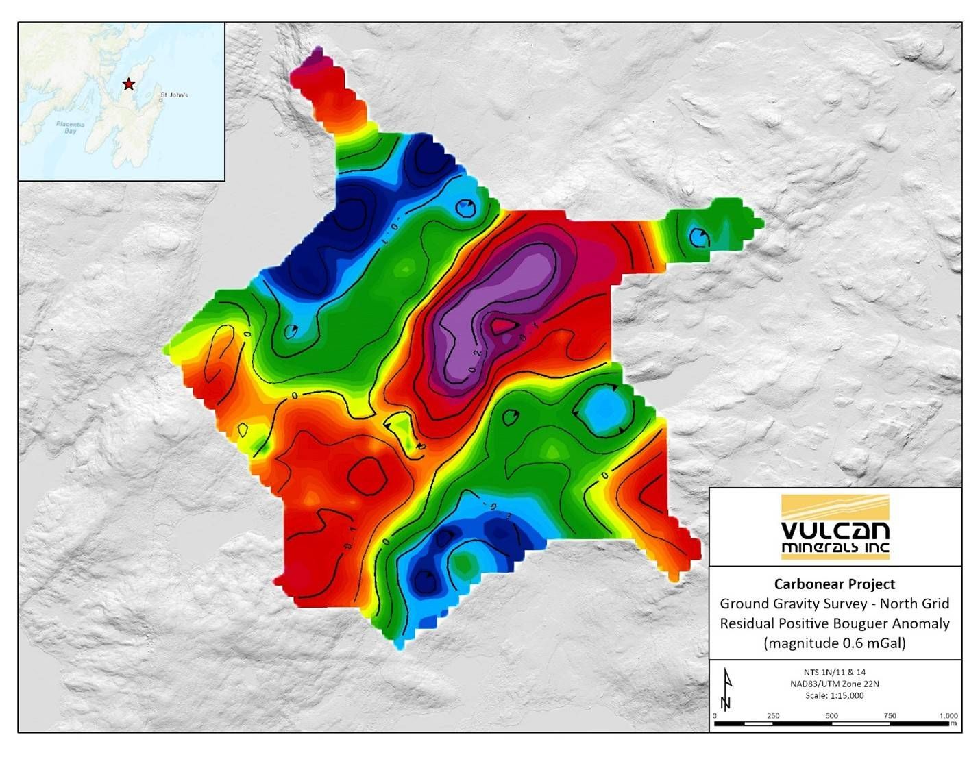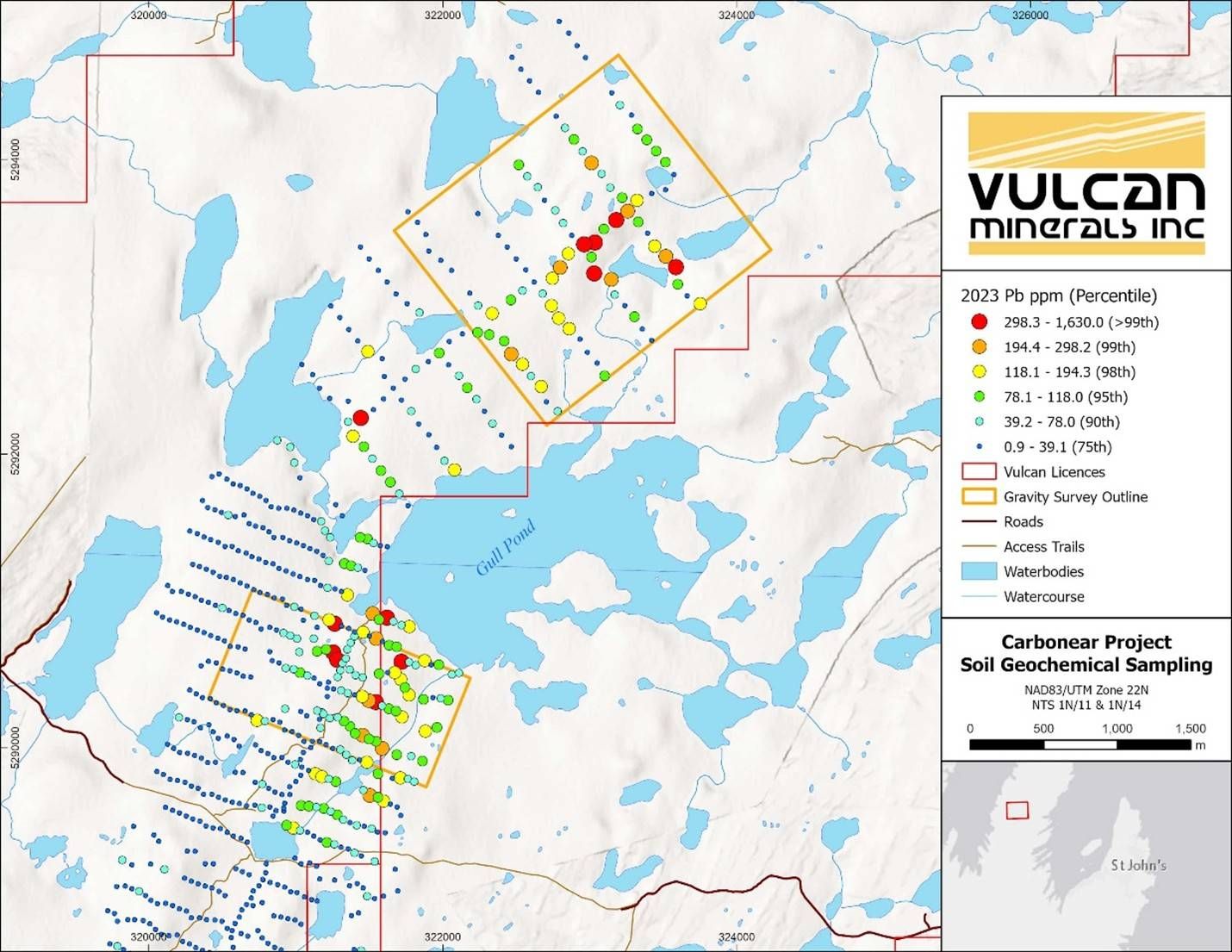 Prior historic drilling in the Gull Pond North area consisted of a total of five shallow holes to test ground electrical conductors. Given that the Company's recent work has enhanced the prospectivity of this general area, the company resampled Holes CP-97-08 and CP-97-10 to better ascertain the tenor of mineralization previously encountered. These holes contain anomalous zinc mineralization over a potential stratigraphic interval of approximately 100 meters based on 23 historic core samples in Hole CP-97-08 and 10 historic core samples in Hole CP-97-10. To confirm and better define the tenor of mineralization, an additional 31 samples over 42.5 meters in Hole CP-97-08 and 26 samples over 47 meters in Hole CP-97-10 were assayed. Mineralization consists of disseminated sulphides in turbiditic siltstones and secondary fracture fillings. A complete compilation of all sample intervals from both holes is available at https://vulcanminerals.ca/carbonear-historical-drill-sampling-results/. This infill sampling demonstrates the consistent nature of the anomalous mineralization. Hole CP-97-08 (76.2 meter total sampled length) has a weighted average of 0.23% zinc and 0.17% lead, including up to 1.2 meters of 4.1% lead and 1.5% zinc. Hole CP-97-10 (60.8 meter total sampled length) has a weighted average of 0.10% zinc and 0.05% lead.