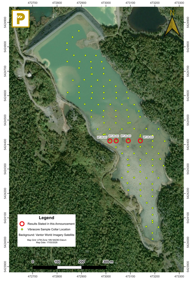 - First batch of tailings core sample assay results (Table 1) received for four Vibracore collar locations (WT-26-001, WT-26-002, WT-26-003 & WT-26-004) situated on part of a single east-west profile (Figure 1), varying in thickness from 4.15m to 12.20m (Table 2).