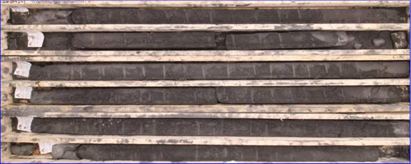 Above: Photo of core tailings material once removed from the plastic cylinder and sawn in half for sampling. One half submitted for assay, one half retained for future studies (Vibracore hole WT-26-004). | |