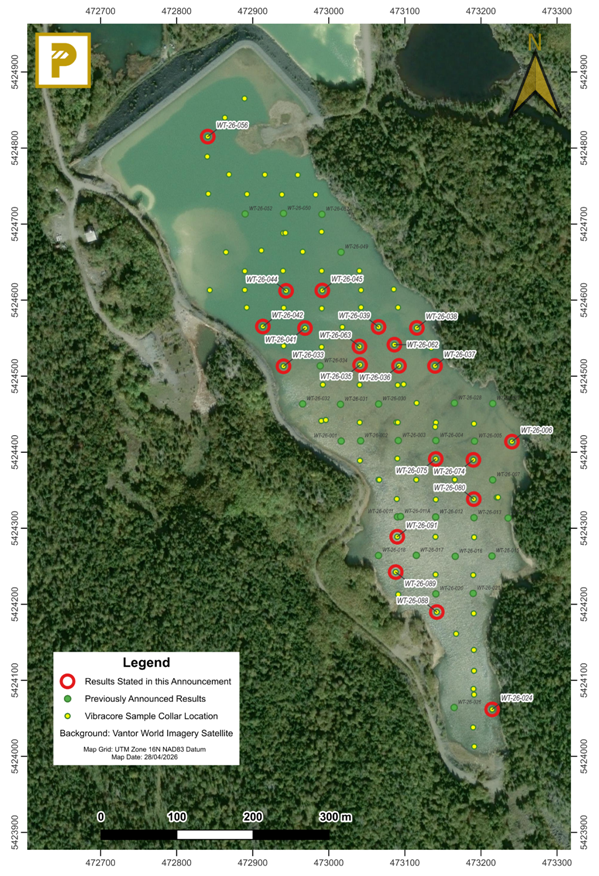 Table Note: UTM Zone 16N NAD83 Datum. WT-26-011A drilled to test for a suspected false bottom encountered in WT-26-011. Table includes statistics for all Vibracore holes reported to 28 April 2026. Batch 4 Vibracore Hole IDs shown bold. * Apparent tailings thickness and vertical profile tested by assays may differ. Depth figures rounded to 1 decimal place. Depth to tailings of WT-26-001 amended from 0.6m to 0.7m.
